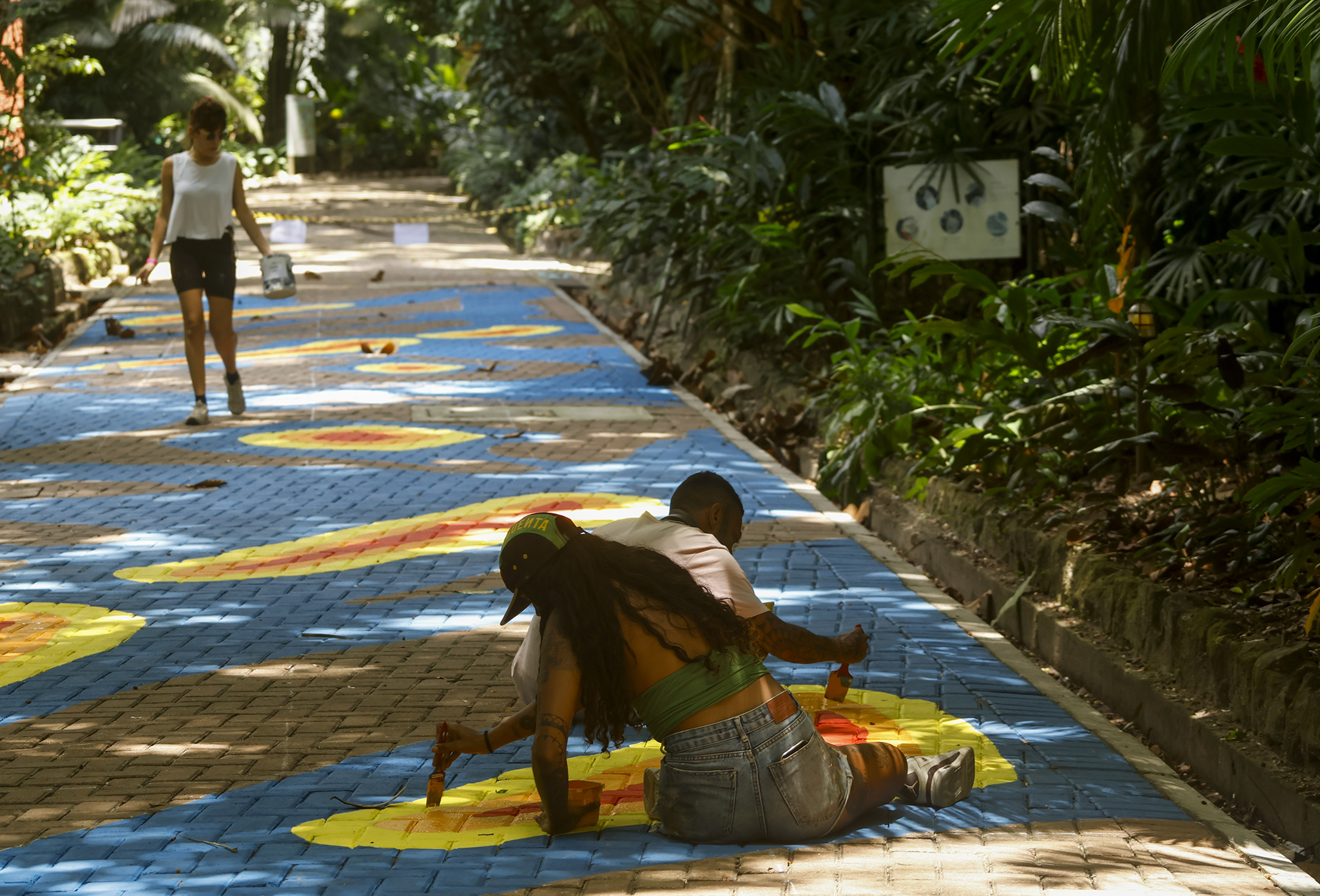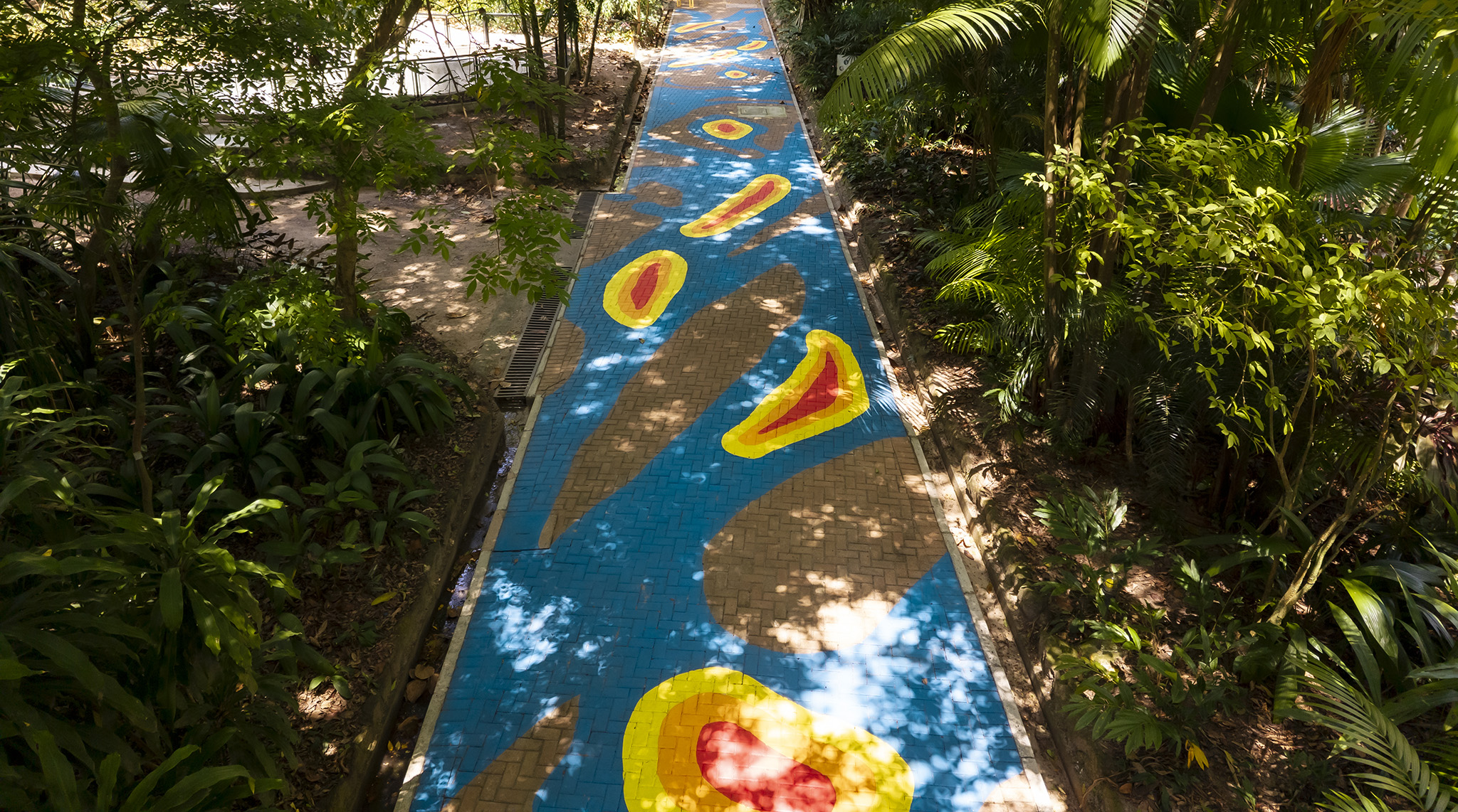 Based on the analysis of satellite imagery and dialogues with scientists, the work adapts the course of the Tefé River onto the pavement of the Emílio Goeldi Zoobotanical Park, creating thermal representations of heat islands through the use of warm colors. This site-specific installation functions simultaneously as a reminder and a warning: rivers are sensitive witnesses to climate change, and we are increasingly close to experiencing irreversible damage.